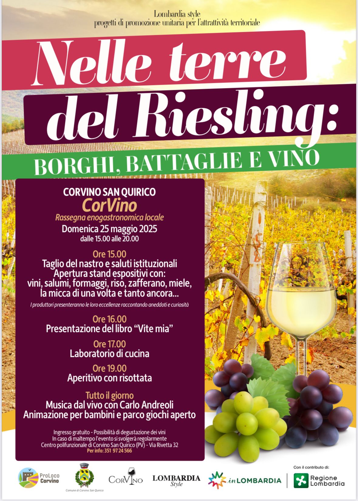 Domenica 25 maggio 2025, presso il Centro polifunzionale di Corvino San Quirico, si svolgerà la Rassegna enogastronomica locale "CorVino, nelle terre del Riesling", secondo il programma allegato.
